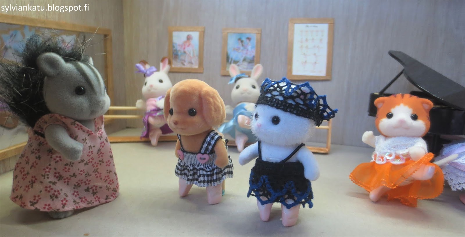 ( Balettistudio on itse rakennettu pahvilaatikkoon, iso peili, tangot ja taulut on itse tehty askartelutikuista. Vaaterekki vaatteineen, sovitus peili, piano ja mallinukke on sylvanian families sarjaa. Mallinuken yllä oleva mekko on tilattu erikseen sylvanian families väelle vaatteita tekevältä ulkomailta. Balettiryhmäläisten vaatteet on itse tehtyjä ja tuunattuja. Prinssin asu on sylvanian families sarjan oma asu. )
